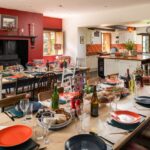 A spacious open-plan kitchen and dining area, equipped with an Aga, two fridges, two dishwashers, a wine cooler, and a bar area, comfortably seating up to 23 guests.