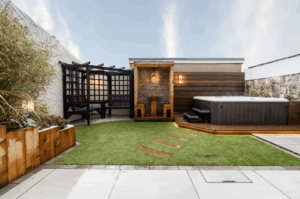 Double glass doors open onto a gorgeous walled garden, complete with a decked hot tub area, wooden pagoda and stone BBQ. It’s the ideal excuse to hire your own BBQ chef! The kitchen includes two fridges, giving you plenty of room for prosecco and party supplies. A large dining table seating 8 ensures everyone can dine together comfortably.