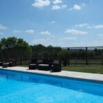 Guests can unwind in the hot tub or enjoy the outdoor swimming pool during the summer. The spacious lounge, complete with comfy sofas, a TV, and a Bluetooth speaker, provides a relaxing area for evening entertainment.