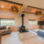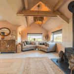 Step inside this fantastic lodge, where rustic elegance meets contemporary comfort. The welcoming entrance hall, adorned with herringbone tiles and upcycled glass light fittings, sets the tone for this unique property. The open-plan kitchen and dining area, equipped with state-of-the-art appliances, provides the perfect setting for group meals, seating up to 14. Adjacent is a cosy lounge with a wood-burning stove, original beams, and an L-shaped sofa, inviting you to unwind in style. Upstairs, the lake-view lounge is a showstopper. Its vaulted ceilings, giant linen light pendants, and private glass-panelled balcony offer a serene space to relax with sunset views or host yoga and workshop events. Outside, the gardens feature expansive lawns, a summer meadow, and multiple decking areas to enjoy the sun throughout the day. The patio boasts a hot tub and comfortable seating, perfect for evenings under the stars.