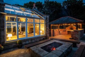 The ground floor comprises a fantastic open-plan living area with comfy sofas, a dining table seating over 16, a superb designer kitchen with two two-door ovens (ideal for hiring a private chef to rustle up a feast for your group), fridge, freezer, dishwasher, microwave, wine cooler (most important feature of course…), and granite work surfaces. A fantastic conservatory / garden room providing extra seating, with wood burning stove included – ideal if you fancy a cosy catch up indoors over a glass of wine or two and some nibbles! To the rear of the cottage is a raised decked area, looking out into woodland with outdoor furniture and a private garden where you will see and hear the resident woodpeckers! Creating an ideal spot in which to enjoy the afternoon sun and sunsets, there is also a new covered outdoor kitchen at the side of the cottage, including pizza oven, BBQ, bar area, fridge, and fire-pit built into a seating area at the front (did someone say BBQ chef?!), which offers great views across to the coast and towards the Lake District. At the rear of the conservatory, overlooking the woods behind, there is a new wood fired hot tub – to enjoy peaceful evenings and enjoy the colder nights.