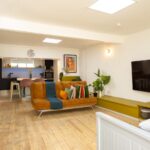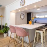 Inside, a spacious living area with large comfy seating and a massive 65″ Smart TV with full cinema package makes it ideal for relaxed group hangouts, film nights and lively catch-ups. The open-plan space flows through to a large dining island, perfect for shared meals, cocktail prep and long brunches with plenty of seating for everyone.