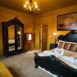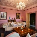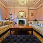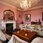 Grand lounge with Chesterfield sofas, ornate fireplace, and tall sash windows — perfect for cosy evenings or sophisticated get-togethers.